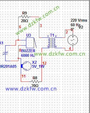 R9、R8为分压电阻,避免继电器短路时烧毁电源及元器件。声光报警元件分别为蜂鸣器、LED,与R9串联成报警回路。正常工作时,比较放大器信号送来后,继电器导通,报警回路被短路,当温度升高时,比较放大器输出高电平,继电器VD截止,报警回路导通,灯和铃导通,报警。