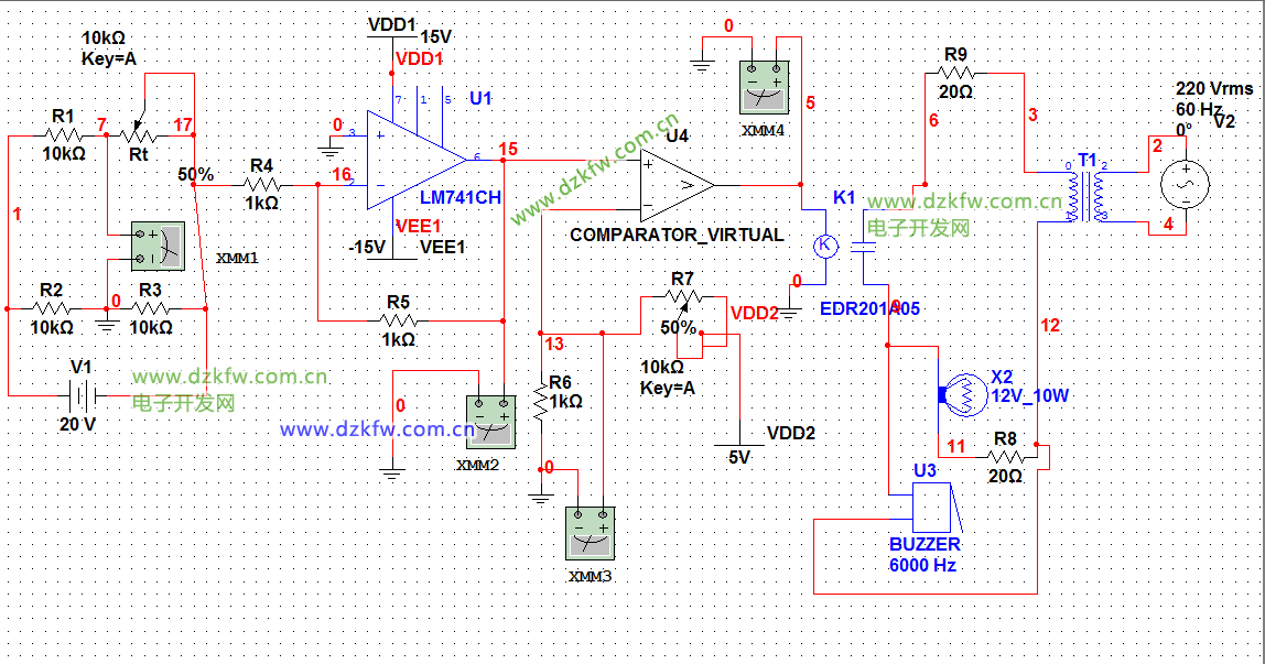 Rt为热敏电阻,初始Rt=R1=R2=R3=10k,电桥平衡,即20℃时。 R9、R8、为分压电阻。可通过R7设置报警温度。当温度升高,Rt电阻阻值减小,从而电桥输出量随之变化. 输出量送入比较放大器进行比较,当其值大于比较放大器R8上电压时,比较放大器导通,继电器截止,报警回路由短路状态变为导通,灯和铃导通,报警成功。