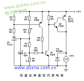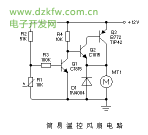 调整VR1,可以设定风扇启动温度,要求不高的话可以直接用一个2K7左右电阻代替。