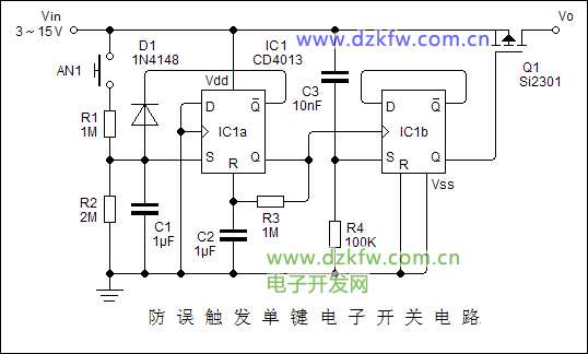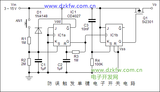 电路也可以用JK触发器,下面是使用CD4027 的单按键防误触发电子开关: