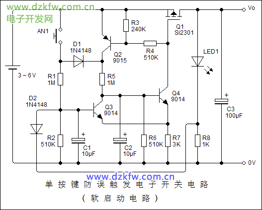 由于电路靠C2、C1 的充电、放电控制电路的开启、关闭,所以具有慢启动的特点,从LED上可以看到逐渐点亮或逐渐熄灭的过程。