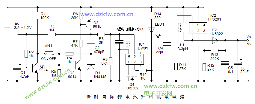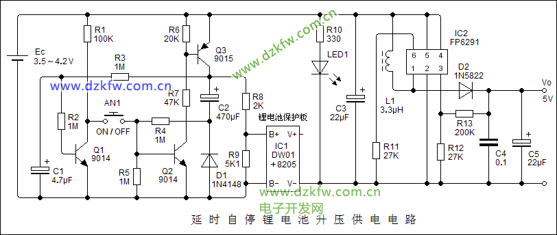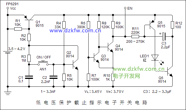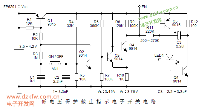 重新画了一下图,不用DW01,使用普通的三极管做电压检测,通过FP6291的EN端控制电路的启动和关闭: