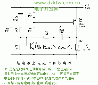 R1 是在延时结束电源断开后,给C1 放电用的。同时用来给电源滤波电容放电。 R3 主要是用来提高电路的可靠性,避免电容C2 的漏电流造成电路关闭不可靠。同时也可以防止Q1 误触发。