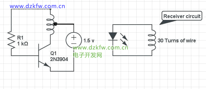 3)制作接收电路:很简单,参照电路图将无抽头线圈的两端焊接至发光二极管两端即可。