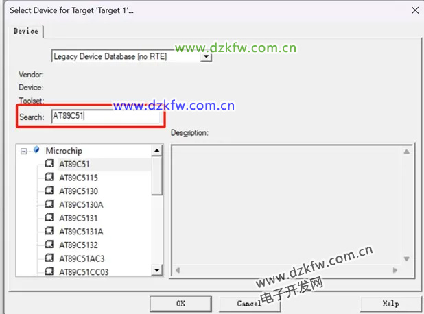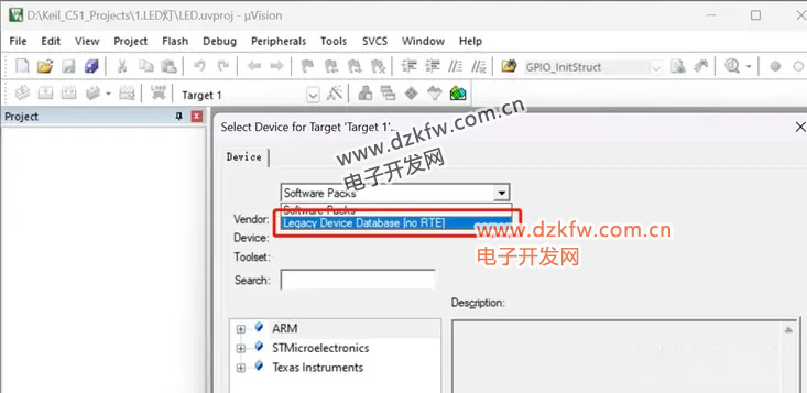 - 弹出如下窗口,因为是写C51代码,所以在"Devices"选择Lagacy Device Database;