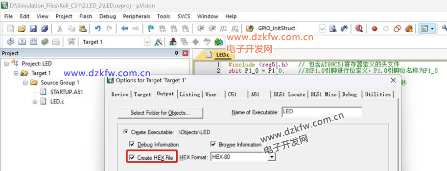 - 在输出"Output"一栏勾选“Create HEX File”,如下图所示: