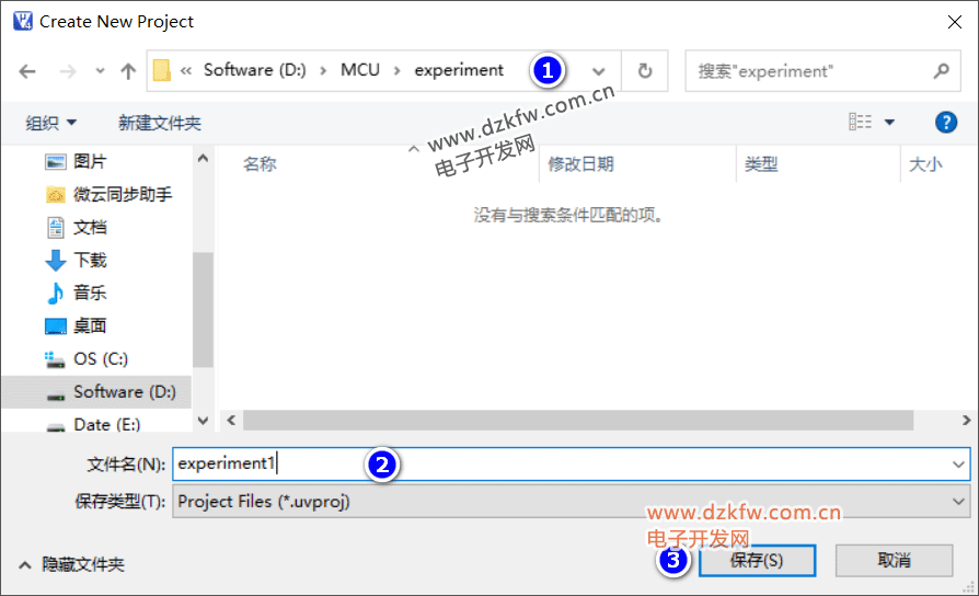 ① 是当前路径,我们在 ② 处填上我们要建立的 keil 工程名字: experiment1,点击 ③ 保存。
