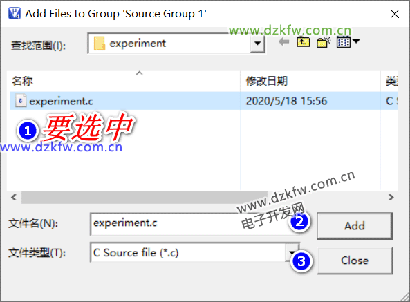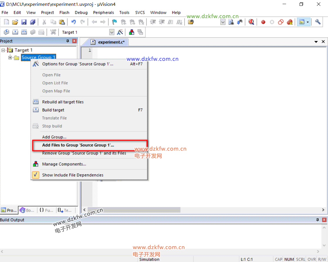 右键,Source Group 1 ,选择刚刚的 C 语言 源文件。