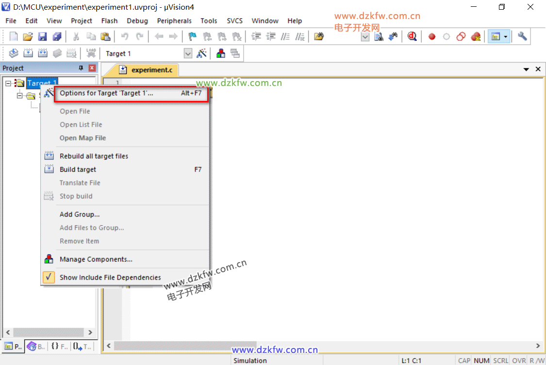 编写好源文件后,右键 Target 1 ,选择图中的 Options for Target 1… 。