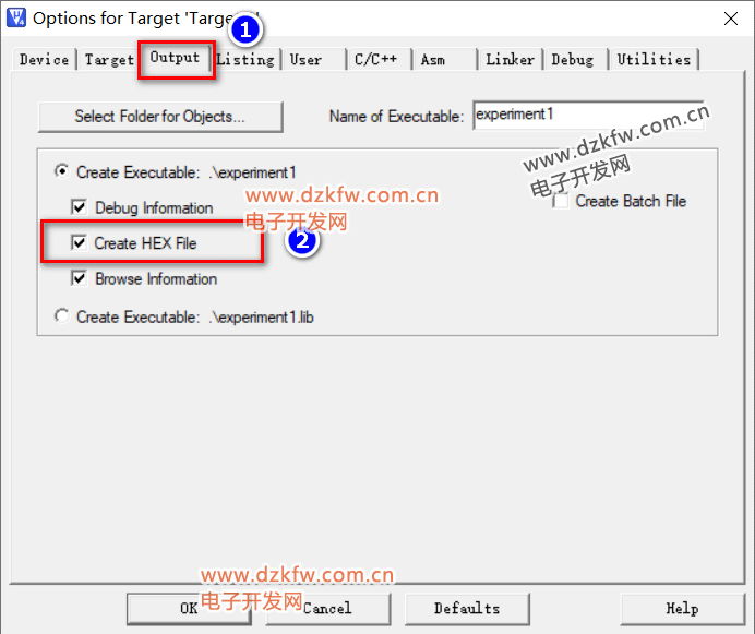 选择 Output ,把 Create HEX File 打上 √ ,默认是没有 √ 的。然后点击 OK,即可。