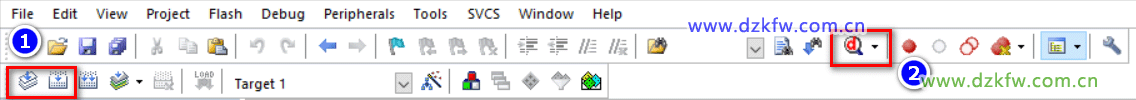 ① 是转换和编译按钮,一般通过 ① 的第一个按钮检查自己的代码有没有错,第二个按钮生成 HEX 文件。