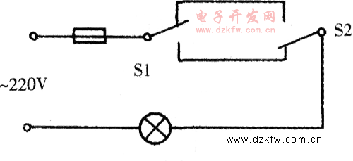 在有些地方需要用两只开关控制一盏灯,如楼梯上使用的照明灯,就需要楼上、楼下都能控制照明灯的亮、灭。用两只开关控制一盏灯的电路如图所示。两只开关都应该用单刀双掷开关。