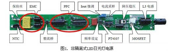 LED日光灯是采用CREE与AOD超高亮LED白光作为发光光源,外壳为亚克力/铝合金。LED日光灯安装比较简单,它分电源内置和外置两种,电源内置的LED日光灯安装时,将原有的日光灯取下换上LED日光灯,并将镇流器和起辉器去掉,让220V交流市电直接加到LED日光灯两端即可。电源外置的LED日光灯一般配有专用灯架,更换原来的就可以使用了。目前,几乎市场上所有led日光灯的电源都是采用内置式。所谓内置式就是指电源可以放在灯管里面。这种内置式的最大优点就是可以做成直接替换现有的荧光灯管,而无需对原有电路作任何改动。所以内置式电源的形状通常都是做成长条形,以便塞进半圆形的灯管中去。内置式电源有两种,一种是非隔离式(图1),一种是隔离式(图2)。