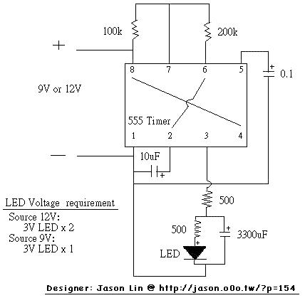 另外输入电压串上3个1N4007降一下压,这样效果会更好,呼吸灯会有短暂的熄灭时间。(只适合绿色和蓝色的LED灯,红色的LED因为发光电压比较低不会有熄灭时间,可以再串一些1N4007来达到效果)