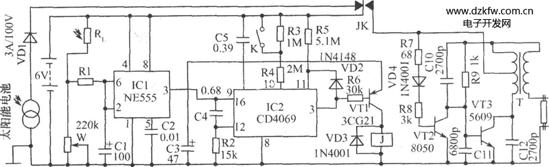 如图所示,详解:太阳能自动控制节能灯电路是由太阳电池充电、光控开关、定时开关和逆变电路4部分组成。要使节能灯点燃必须满足光控和定时两个控制开关都接通这个条件,缺一不可。白天,太阳光照射在太阳能电池板上,太阳能电池板把光能转换为电能通过二极管VD1向蓄电池充电。VD1串接在充电电路中以避免夜间无光照时,蓄电池的电流反向流向太阳能电池板。白天,RL硫化镉光敏电阻的阻值呈低阻状态,IC1的2、6脚输入电压大于(2/3)Vcc,其3脚输出低电平,使IC2和VT1无电压不工作,继电器J不动作,未能接通逆变电路,节能灯不亮;入夜,RL呈高阻值,使IC1输入瑞电压小于(1/3)Vcc,3脚跳变为高电平,IC2及VT1得电进入工作状态。IC2是一片带振荡器的14位二进制串行计数/分频集成电路,C4、R3,R5与IC2内部电路构成的振荡电路产生一正尖脉冲,使IC2自动清零,计数开始,此时IC2的3脚输出低电平使VT1获得偏流并导通,串接在VT1集电极回路的继电器J吸合接通逆变电路,点燃节能灯,经过一段(定时)时间,IC2的3脚眺变为高电平,VT1失去偏流而截止,节能灯熄灭。与此同时,IC2的3脚输出高电平经隔离二极管VD2加至脉冲输入端11脚,使该端恒为高电平而振荡停止,电路状态一直保持到天亮IC2断电为止。电路中R1、C1组成抗光干扰延时电路,以防止夜晚瞬间光照(如雷电闪光、车辆灯光等)干扰被控灯的正常工作。节能灯每晚点燃的时间由公式T≈2.3N(R3 R4)C5计算,N为定时系数。当开关K断开时,定时时间约为6h,适合于冬季夜晚;当K闭合时,定时约4h,适合夏季夜晚。节能灯逆变电路由VT2、VT3等组成。节能灯电路接通时,通过VT2、VT3、逆变变压器T1实现反馈、振荡、升压等过程,使得节能日光灯两端有160V~180V电压而点亮。点亮时消耗蓄电池电流0.4A左右,使用30A时蓄电池可在无太阳时连续工作一个星期。RL选择MG44-04光敏电阻。其他元器件如图所示。