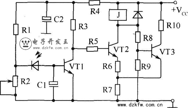 如图所示,在白天,硅光电池输出电压使VT1导通,VT2截止,继电器不吸合;天黑时,硅光电池输出电压渐小,使得VT1截止,VT2导通,继电器吸合,照明灯亮。电路中VT2、 VT3组成施密特触发器,用来避免照明灯产生忽明忽暗的抖动现象。L也可在较宽范围内选择点亮照明灯的照度(即天黑到什么程度亮灯),电容C起延时作用(约5s),以避免闪电引起瞬间灭灯现象。