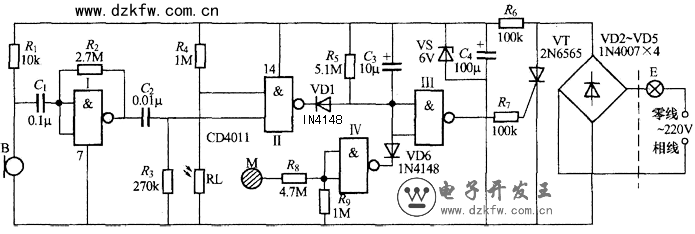 声、光与触摸三控楼梯延迟灯电路图。声控,光控,触摸控制的电灯电路图