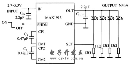 MAX1913的输入电压范围为2.7~5.3V,它可提供稳定的输出电压或输出电流,以驱动白光LED。MAX1913驱动白光LED电路如图所示。它只需4个小陶瓷电容而无 须电感就能完整地组成DC/DC调节器。其独特的电荷泵设计可使输入纹波减小,且能在很宽的负载范围内维持稳定的750kHz开关频率。MAX1913还包括逻辑电平关 断和软启动功能,以减小启动时的输入浪涌电流。其主要特性如下。