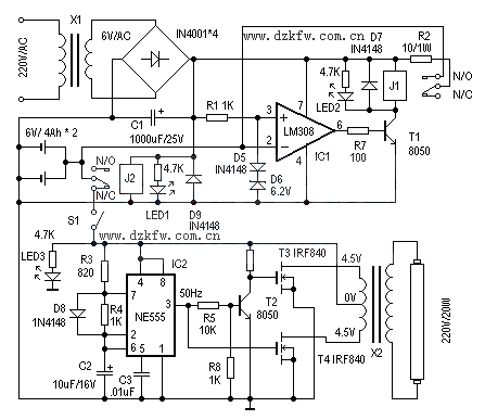 由IC2(NE555)、T2、T3、T4、X2等组成应急灯电路。IC2组成50Hz信号发生器,由IC2的3脚输出50Hz信号,经T2反相、放大分别驱动由T3、T4、X2组成的推挽电路,在X2的高压侧感应出220V的交流电,使日光灯管点亮。这里的X2可以直接使用次级为4.5伏、初级为220V的成品电源变压器,功率试日光灯管的功率而定。使用时,注意T3、T4应加散热器。