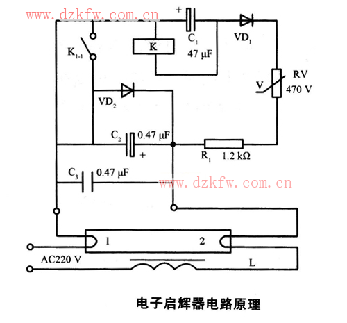 如图为电子启辉器电路原理图。当接通220V电源时,电流经灯管灯丝1、继电器的Κ线圈、二极管VD1、压敏电阻RV、电阻R1、灯丝2、镇流器L,与电源形成回路,灯丝被预热。预热期间,接通的Κ的常开触点K1-1和VD2串联的支路完全分流掉了VD1充电支路的电流,使K的线圈靠C1存储的电压维持触点闭合。由于C1经线圈充放电,C1的端电压逐步由上升转至下降,下降到约为吸合电压的一半左右时,触点K1-1断开,L的自感电压和电源电压串联加在两组灯丝间,管内低压水银蒸气产生辉光放电,日光灯被点燃。灯管点燃后,灯管端电压低于90V,压敏电阻RV呈断路状态,触点保持断开,日光灯正常运行。灯丝预热时间长短,由C1上的充电电压6V放电到3V所用的时间决定,故与C1容量、Κ线圈的电阻有关。灯丝预热时间长短9会严重影响灯管的使用寿命。