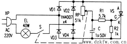 电路如图所示,由电源插头XP、白炽灯泡EL、电源开关S、整流二极管VD1~VD4、单相可控硅VS与电源构成主电路;由调光电位器RP、电容C、电阻R1与R2构成触发电路。将XP插入市电插座,闭合S,接通220V交流电源,VD1~VD4全桥整流得到脉动直流电压加至RP,调节RP的阻值,就能改变C的充/放电时间常数,即改变VS控制触发角,从而改变VS的导通程度,使EL获得0~220V电压。RP的阻值调得越大,则EL越暗,反之越亮,达到无级调光的目的。