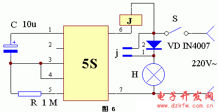 白炽灯延时开关电路工作原理如图6所示。不合上电源开关S是地,由于RC的延时作用,刚开始时,5S模块的③、④脚为高电平,模块内部的电路关断,继电器J处于释放状态,由于二极管的作用,使灯泡H两端的电压仅为额定电压(220V)的0.45倍,即99V。这样就大大减小了由于灯泡冷态灯丝电阻低而产生开灯时的浪涌电流,即实现了低压预热(增大灯泡灯丝电阻)作用。经过一段时间后,C通过R充电。使5S的③、④脚电压越来越低,最后导致模块内部电路工作状态发生翻转,继电器吸合,其常开触点闭合,短接了二极管VD,使灯泡H获得全压(220V)工作。这样可延长灯泡的使用寿命。5S模块延时开启时间通过1.1RC计算得出。继电器J应采用交流型。该电路适用于白炽灯群,如路灯、走廊灯等。