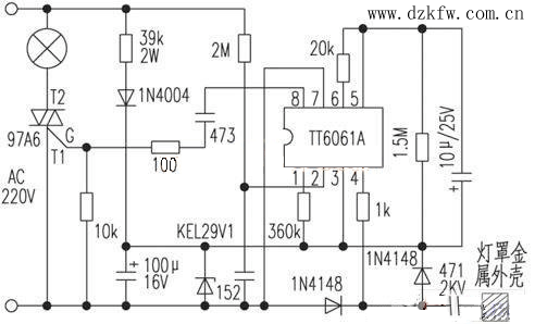 最近,笔者对一种新的触摸式台灯按其实物画下了电路,现提供大家参考。电路见图,它分四挡控制灯泡的亮度。通电后灯泡不亮,第一次轻轻触摸一下灯罩金属外壳。灯泡便发出低亮度的光,第二次触摸灯泡发出中等亮度的光,第三次触摸灯泡变为全亮,第四次触摸灯泡熄灭,依次循环。此电路易出现的故障是双向可控硅97A6坏及灯罩金属外壳与电路触摸输入端子之间接触不良。笔者调试该电路时,TT6061用GS6061代,1N4004用1N4007代,其余元件与图中同。经验证,电路工作可靠,能实现文中所述功能。但双向可控硅易损坏,建议读者制作时在可控硅两端并联一电阻电容串联所组成的保护电路。