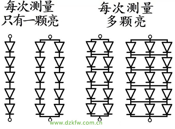 准备一块万用表拨到Rx10K档(数字表二极管档),测一下铝基板上的灯珠,用以了解其串并方式。看每次测量有几颗灯珠发光,便是几并。然后用灯珠总数除以并数,便是串数。