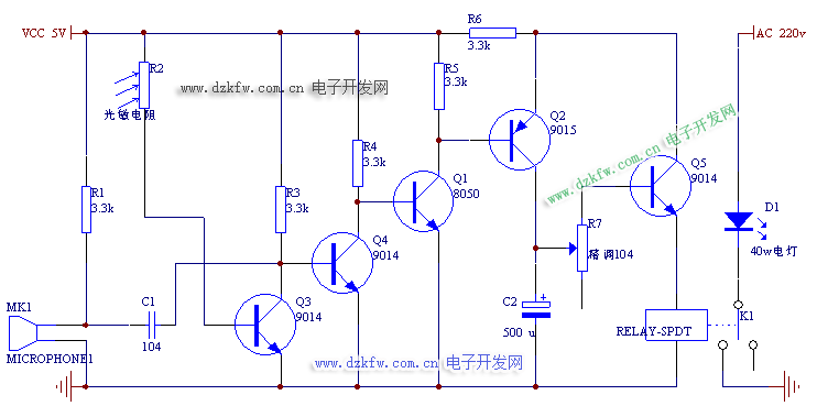 1:首先声音信号通过麦克风传入Q4经Q4和Q1两极放大使Q2导通,对C2 进行充电,并瞬间导通Q5.