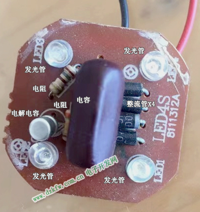 上图的阻容降压,其中R1和C1并联的阻抗73.4kΩ,发光二极管通过电流约220v/73.4kΩ=2.99mA。