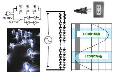 采用交流电源直接驱动LED 的方式近年来也获得了一定的发展, 其应用示意图参见图5。这种结构中LED 串以相反方向排列,工作在半周期,且LED 在线路电压大于正向电压时才导通。这种结构具有其优势,如避免AC-DC 转换所带来的功率损耗等。但是,这种结构中LED 在低频开关,故人眼可能会察觉到闪烁现象。此外,在这种设计中还需要加入LED 保护措施,使其免受线路浪涌或瞬态的影响。
