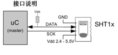 微处理器和温湿度传感器通信采用串行二线接口SCK和DATA,其中SCK为时钟线,DATA为数据线。该二线串行通信协议和I2C协议是不兼容的。在程序开始,微处理器需要用一组"启动传输"时序表示数据传输的启动,当SCK时钟为高电平时,DATA翻转为低电平;紧接着SCK变为低电平,随后又变为高电平;在SCK时钟为高电平时,DATA再次翻转为高电平。