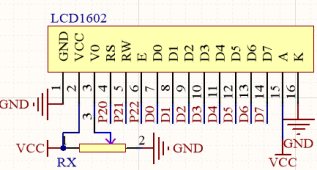 该模块采用LCD1602液晶屏将电子时钟工作的实时状态显示在屏幕上,结构简单,显示清晰。其中GND接地,VCC接VCC,LCD偏压输入引脚V0通过接一个电位器来调节显示屏的背光度,数据/命令选择端RS、读/写控制信号端RW、LCD使能端分别由单片机引脚P2.6、P2.5、P2.7进行控制。数据传输端D0-D7则用单片机的P0口进行控制。如图是LCD1602详细的电路引脚连线图。