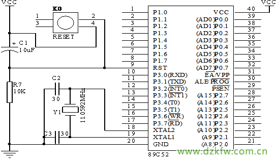 当在89C5x单片机的RST引脚引入高电平并保持2个机器周期时,单片机内部就执行复位操作,按键手动复位有电平方式和脉冲方式两种。其中电平复位是通过RST端经过电阻与电源VCC接通而实现的。
