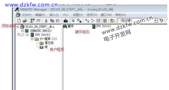 S7-300系列PLC的工程项目的建立、硬件组态、编程、下载和上装以及程序状态诊断和监控都由西门子的配套软件SIMATIC Manager来管理和维护,如下图所示。