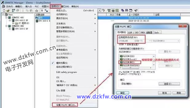 在“SIMATIC Manager”中,通过菜单命令:“选项->设置PG/PC接口”,进行网络端口设置,如下图所示。这一步,也可以在“控制面板”中的“设置PG/PC接口”中设定。工程师站需要和PLC通讯,因此应用访问点要选择“STEP7”,接口根据实际情况选择(这里我们用到时PLCSIM,因此选择PLCSIM(MPI)。)