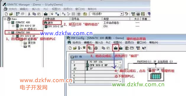 将工程师站的程序下载到PLC中去执行。分为硬件的编译和下载以及程序的下载两部分。