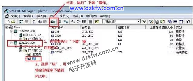 上述步骤为下装全部用户程序,要单独下装某一个或某几个程序块,可选中它们,再执行“下装”操作。
