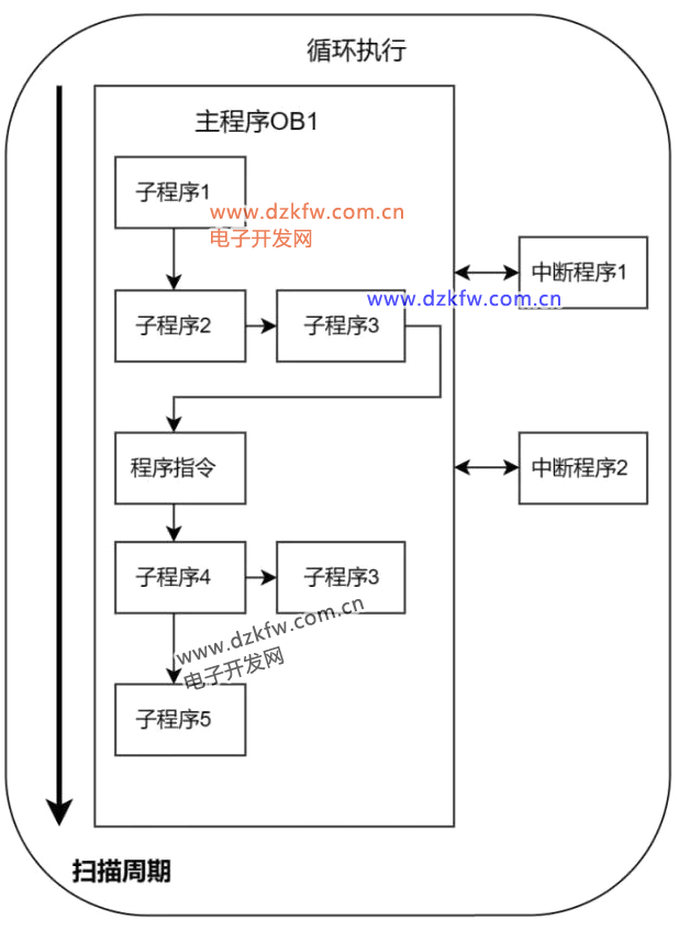 CPU循环执行程序块中OB1主程序及主程序中调用的子程序的内容。执行相关中断程序。