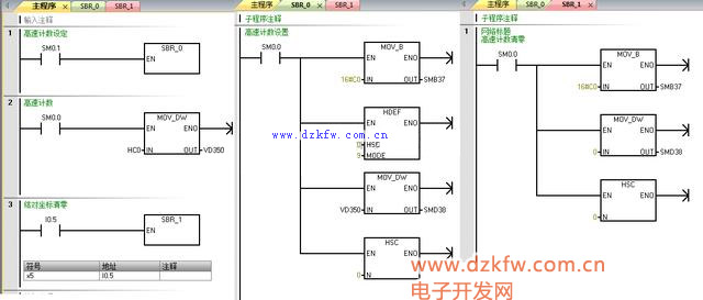 编程说明;在PLC上电时SBR0对编码器进行系统设置,并且将上次停机时的数值记录进去,即保存上次PLC停机前的状态。然后将编码器值发送给VD350进行计算,在I0.7触发的情况下跳入SBR1进行清零操作,如果需要进一步计算的话请使用VD350进行转换。