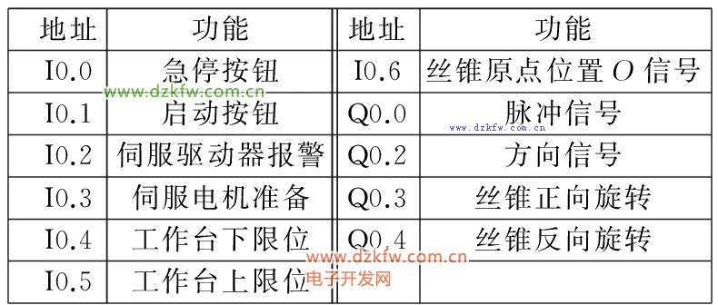 则PLC输出脉冲频率为 =50 kHz。由于CPU224XPCN晶体管输出最高频率达100 kHz,故选用CPU224XP CN DC/DC/DC可以满足上述要求。此型号CPU配置有两个内置脉冲发生器端口Q0.0和Q0.1,以Q0.0作为伺服驱动器的脉冲输入端子,根据分析得到的PLC I/O分配如表1所示。