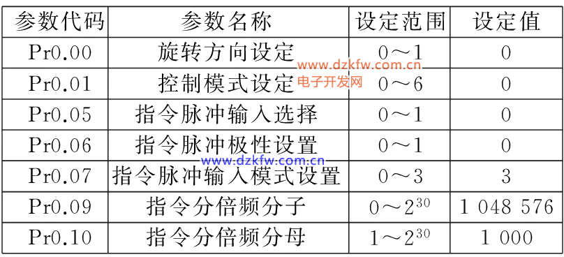 伺服驱动器主要参数设置见表2。其中,Pr0.00设为0,正向指令时,从轴侧看电机为顺时针方向旋转,负向指令时,从轴侧看电机为逆时针方向旋转;参数Pr0.01为控制模式选择,设置0为位置控制模式;Pr0.05为指令脉冲输入模式选择功能代码,设置0为光电耦合器输入;Pr0.06为指令脉冲极性设置功能代码,Pr0.07为指令脉冲输入模式选择功能代码,两指令须配合使用,本控制系统采用脉冲序列+符号脉冲串输出形式,设定Pr0.06=0,Pr0.07=3;Pr0.09与Pr0.10分别为指令分倍频的分子与分母参数设置功能代码,由于指令分倍频比D=1 048 576/1 000,设置Pr0.09=1 048 576,Pr0.10=1 000。