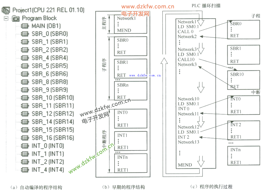S7-200的程序结构与执行过程如图1 (c)所示。