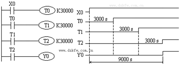 如图所示。当X0接通,T0线圈得电并开始延时,延时到T0常开触点闭合,又使T1线圈得电,并开始延时,当定时器T1延时到,其常开触点闭合,再使T2线圈得电,并开始延时,当定时器T2延时到,其常开触点闭合,才使Y0接通。因此,从X0为ON开始到Y0接通共延时9000s。