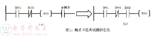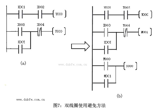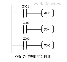 图(b)中,X001和X002接点控制辅助继电器M000,X003~X005接点控制辅助继电器M001,再由两个继电器M000,M001接点的并联组合去控制线圈Y000。这样逻辑关系没变,却把双线圈变成单线圈。