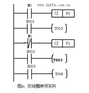 注意:我们所说的是不宜(最好不要)使用双线圈,双线圈使用并不是绝对禁止的,在一些特殊的场合也可以使用双线圈,这时就需要你有较丰富的编程经验和技巧了。下面我们会谈到这一点。但对于初学者还是不要冒这个险。其实,从以上的例子可以看出,重复利用线圈之所以会造成Y003的输出混乱,是由于程序是从上到下顺序执行的缘故造成的。但如果我们可以改变程序执行的顺序,保证在任何时刻两个线圈只有一个驱动逻辑发生,就可以使用双线圈。其中,最常用的方法就是使用跳转指令。如下图所示: