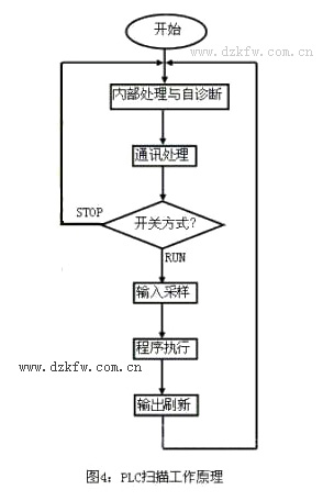 PLC的CPU采用循环扫描的工作方式。一般包括五个阶段(如图所示):内部诊断与处理,与外设进行通讯,输入采样,用户程序执行和输出刷新。当方式开关处于STOP时,只执行前两个阶段:内部诊断与处理,与外设进行通讯。