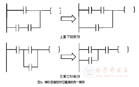 三,并联块串联时,应将接点多的去路放在梯形图左方(左重右轻原则);串联块并联时,应将接点多的并联去路放在梯形图的上方(上重下轻的原则)。这样做,程序简洁,从而减少指令的扫描时间,这对于一些大型的程序尤为重要。如下图所示: