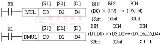 MUL指令是将两个源元件中的数据的乘积送到指定目标元件。如果为16位数乘法,则乘积为32位, 果为32位数乘法,则乘积为64位,如图5.25所示。数据的最高位是符号位。