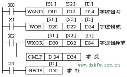 字逻辑运算指令包括WAND(字逻辑与)、WOR(字逻辑或)、WXOR(字逻辑异或)和NEG(求补)指令。使用方法如图所示。